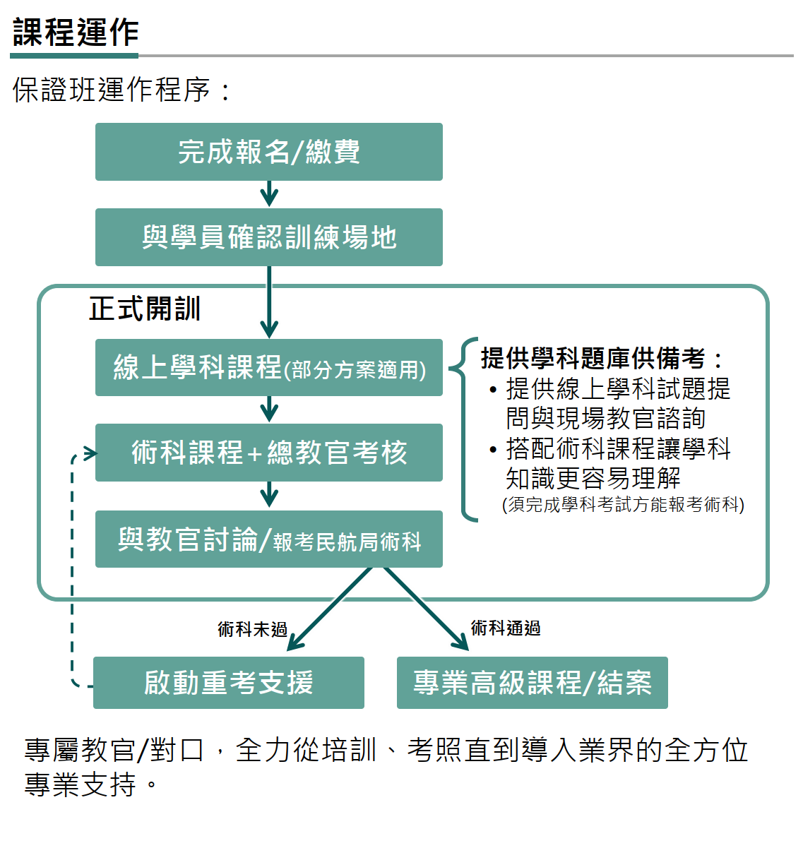 | 專屬教練 指導 | 享充足的操作時數並提供針對式指導,讓學習效率加倍 | 因人數多、實際飛時與個別指導少 |