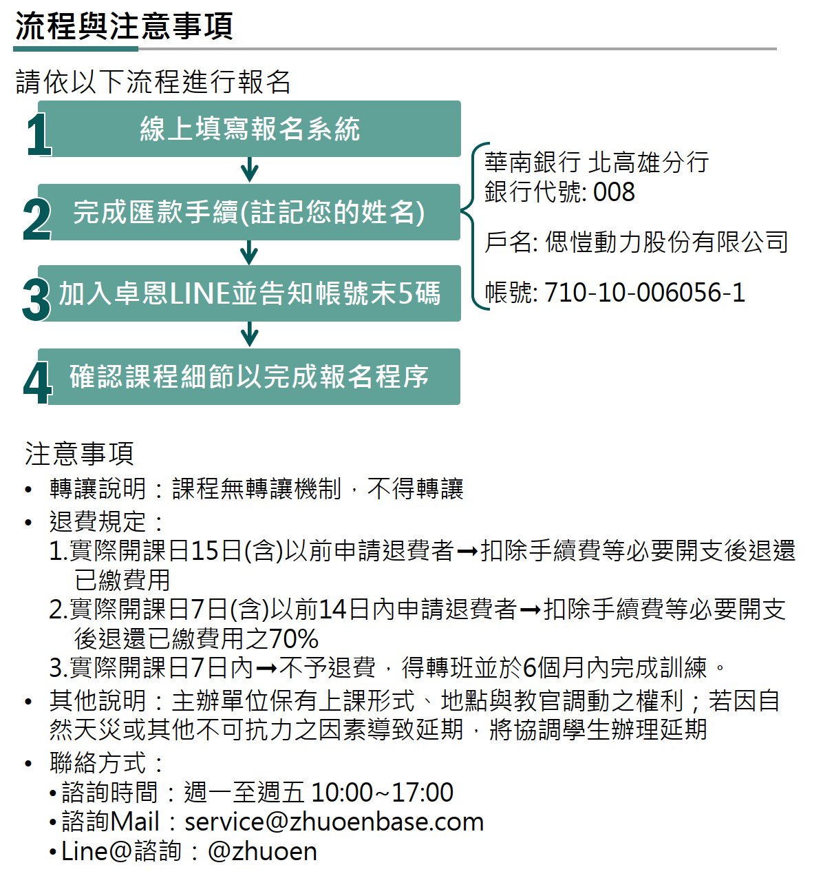 課程無轉讓機制,不得轉讓。主辦單位保有上課形式、地點、設備與教官調動之權利;若因自然天災或其他不可抗力之因素導致認證課程延期,卓恩將協調學生參與後續期別之對應課程。
