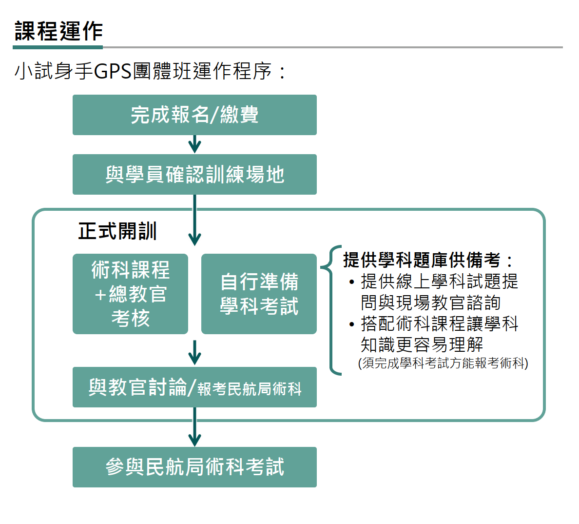 | 專屬陪 考支援 | 指定場次供學員選取後安排教官全程陪考與設備支援 | 大部分需額外租用設備 |