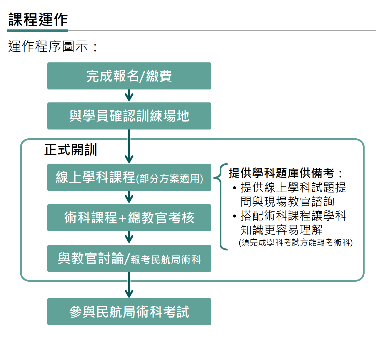 小班 制訓 練 | 一人開班 (三人滿班),學員享足夠操作時數並提供針對式指導 | 因人數多,實際飛時與個別指導少 |