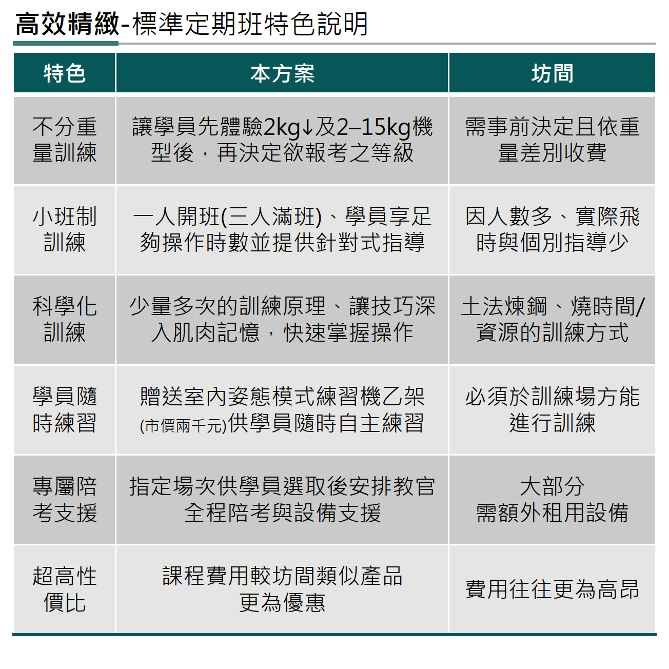 不分 重量 訓練 | 讓學員先體驗 2kg↓ 及 2-15kg 機型後,再決定欲報考之等級 | 需事前決定且依重量差別收費 |