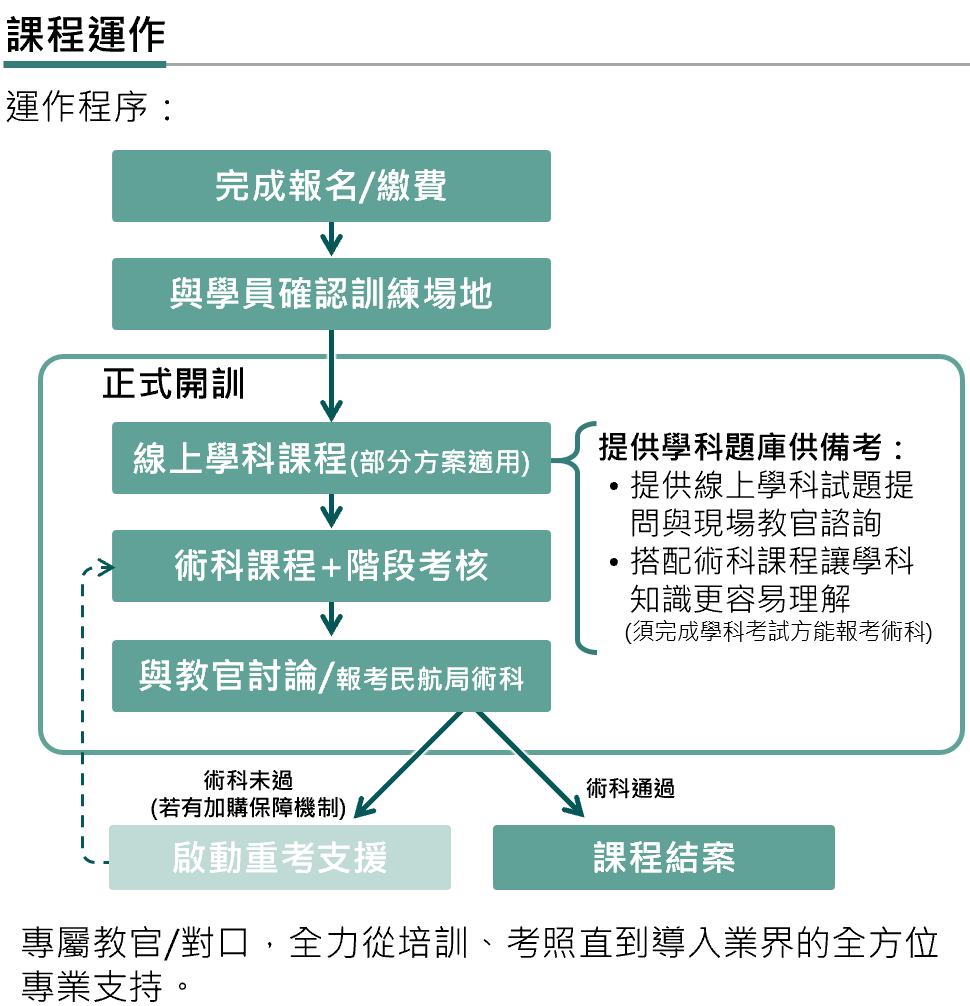 | 進度檢視與動態優化 | 採美國航空人為因素研究員制定之專屬訓練綱要,搭配總教官定期檢核,確保學習成效曲線穩定向上 |