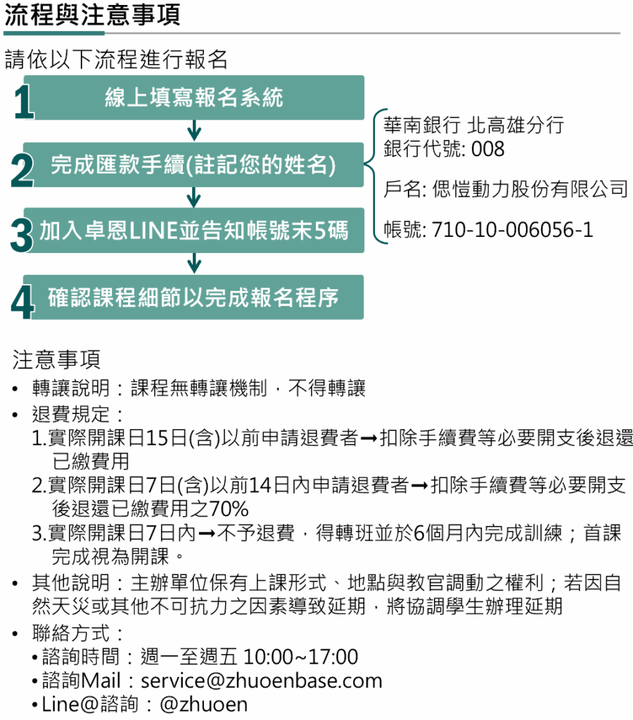 | 課程定價 | 專業基本級:24,000元 專業基本級+專業高級(G1,G2,G3任一組):36,000元 專業基本級+專業高級(G1,G2,G3任兩組):48,000元 專業基本級+專業高級(G1+G2+G3):60,000元 ⭐保障機制僅能於報名時購買(5000元),購置後若有上高級課程者,其高級首考未過關亦適用,而不需分別購買 ⭐以下方《線上報名系統》報名,以獲取優惠價格 |