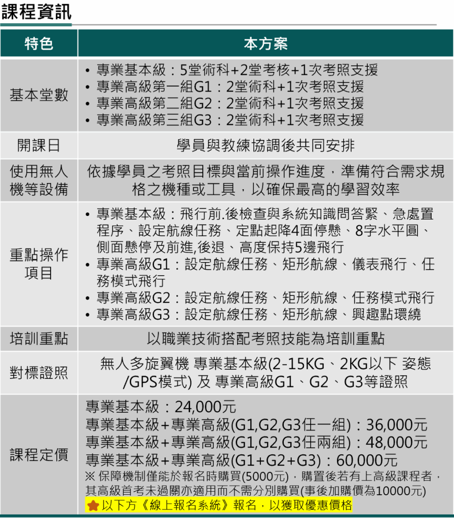 | 對標證照 | 無人多旋翼機 專業基本級 (2-15KG、2KG以下 姿態/GPS模式) 專業高級G1、專業高級G2、專業高級G3 |