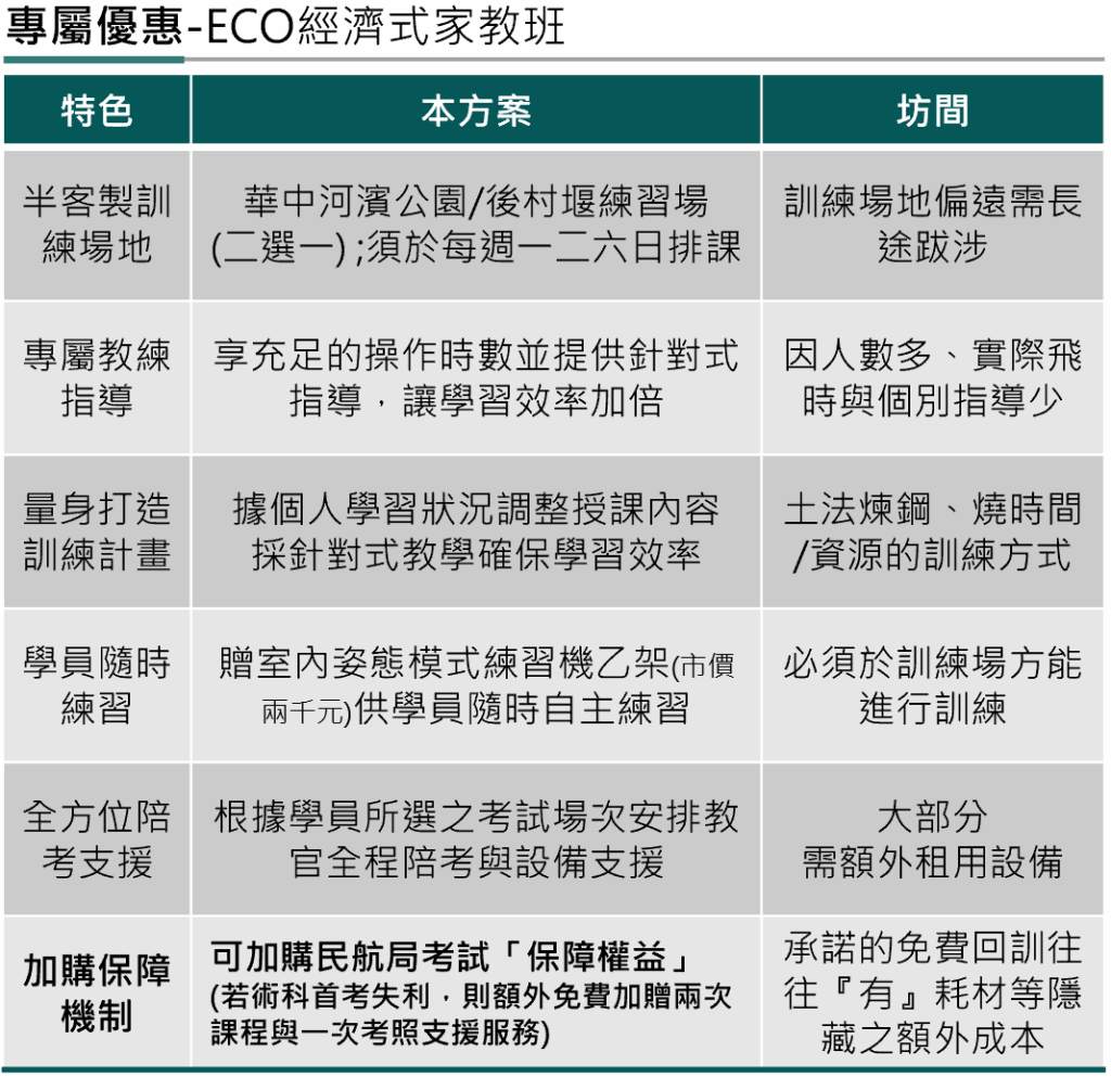 | ⭐優惠加購保障機制 | 可加購民航局考試「保障權益」 (若術科首考失利,則額外免費加贈兩次課程與一次考照支援服務) |