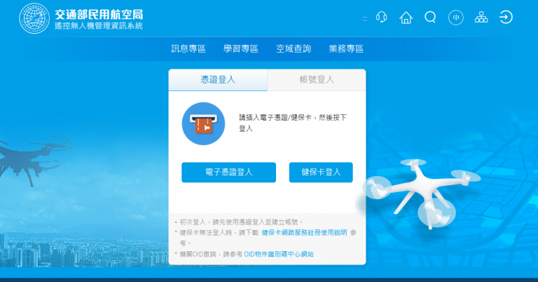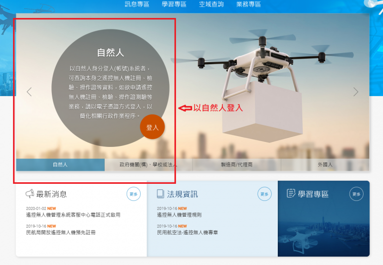 - 至「民航局遙控無人機管理系統」,選擇身分(自然人/法人)並登入。