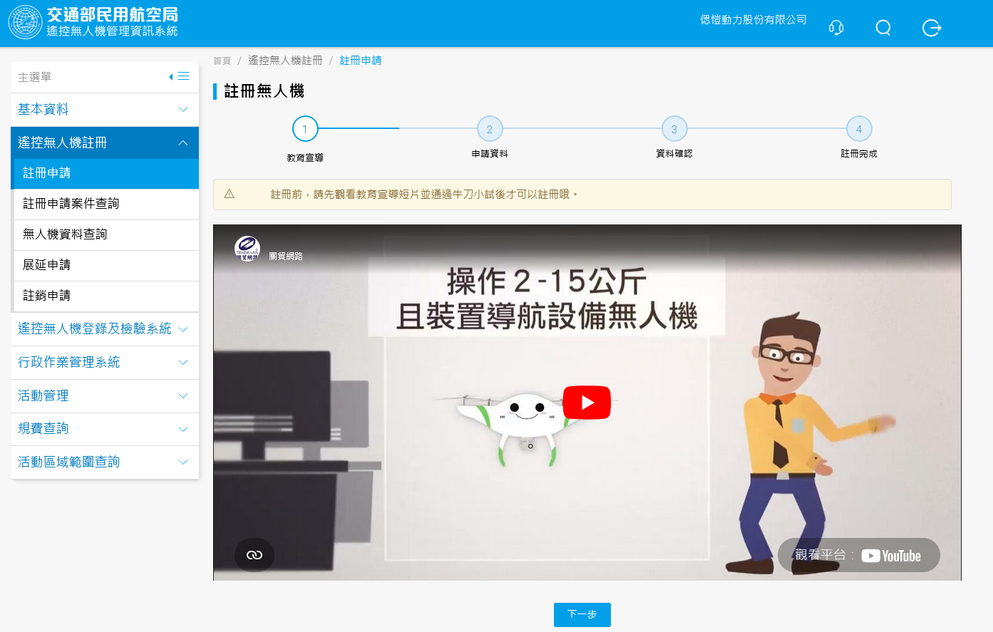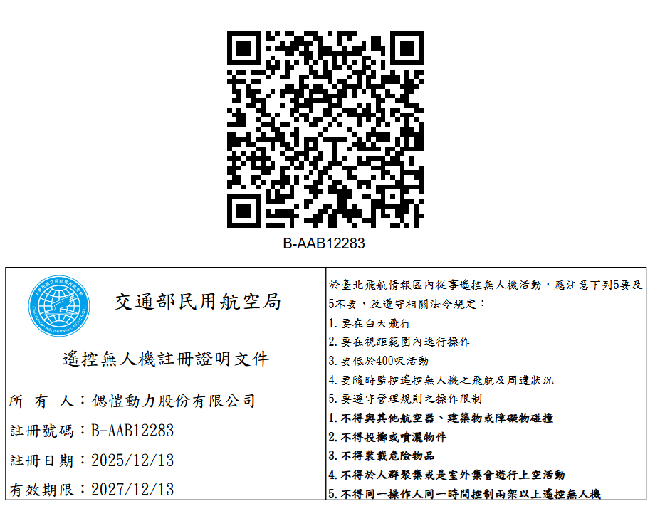 - 法人申請必備: 對於政府、學校或公司等法人單位,在進行**「空域申請」或「活動申請」**時,系統會強制要求提供該機器的「註冊碼」與有效的「保險證明」,缺一不可,否則無法核准飛行。