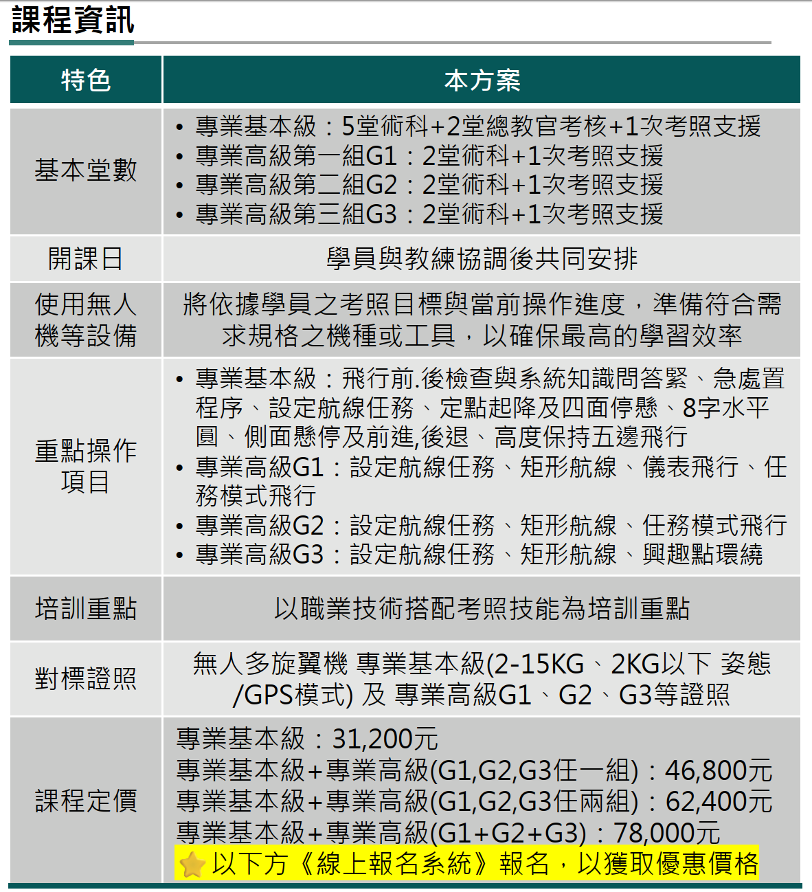 | 對標證照 | 無人多旋翼機 專業基本級(2-15KG、2KG以下 姿態/GPS模式) 及 專業高級G1、G2、G3等證照 |