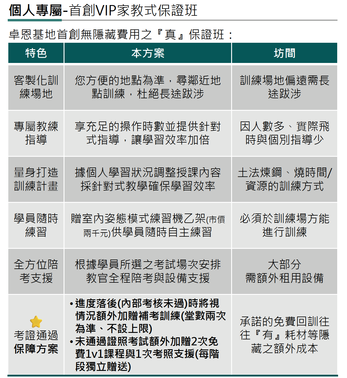 | 專屬教練 指導 | 享充足的操作時數並提供針對式指導,讓學習效率加倍 | 因人數多、實際飛時與個別指導少 |