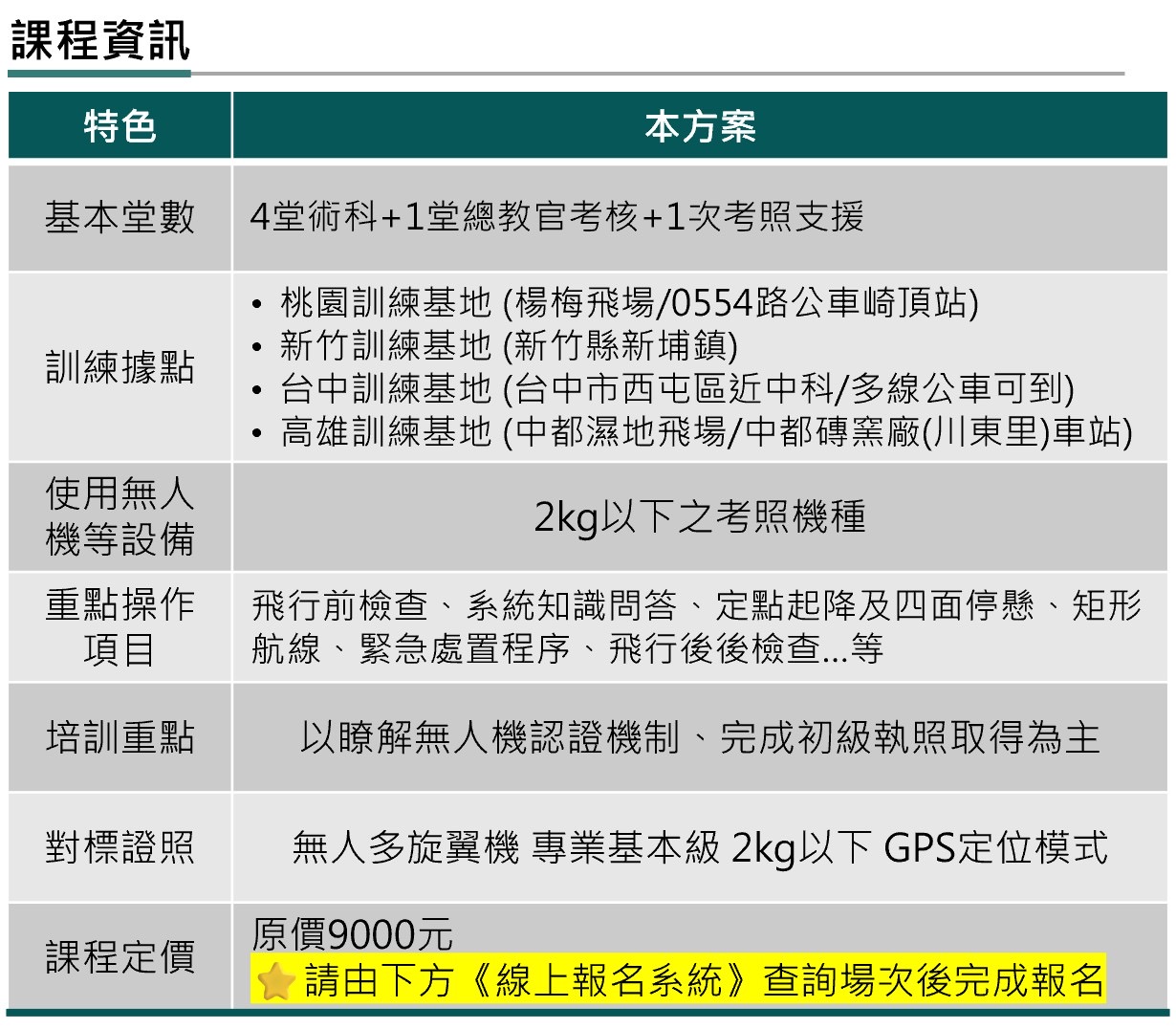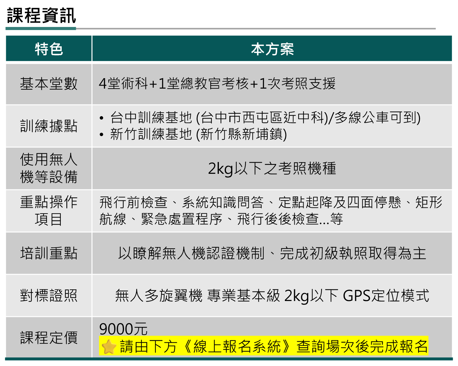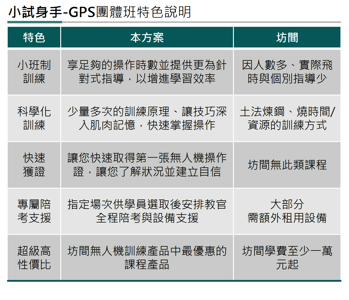 | 快速 獲證 | 讓您快速取得第一張無人機操作證,讓您了解狀況並建立自信 | 坊間無此類課程 |