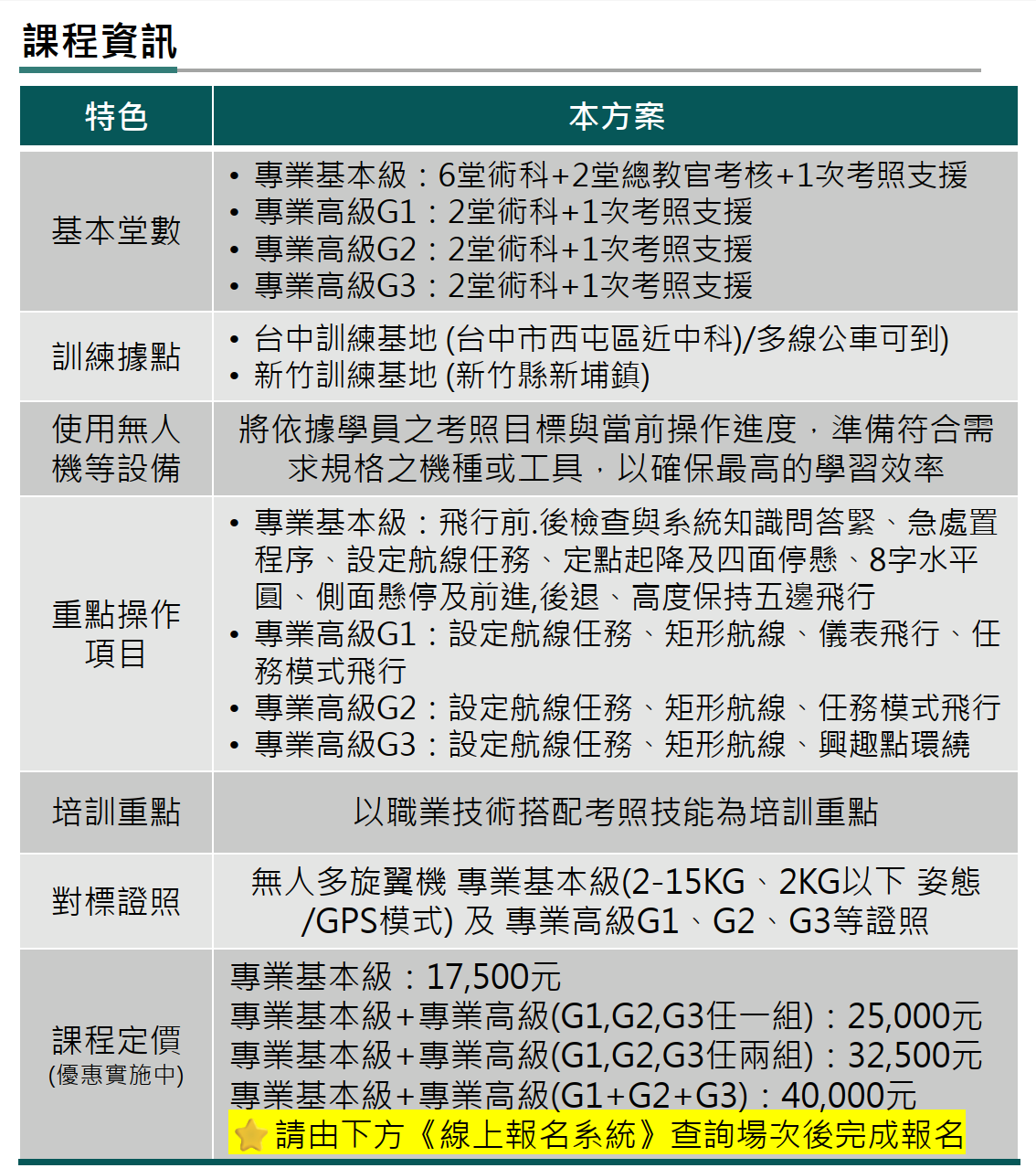 | 對標證照 | 無人多旋翼機 專業基本級(2-15KG、2KG以下 姿態/GPS模式) 及 專業高級G1、G2、G3等證照 |